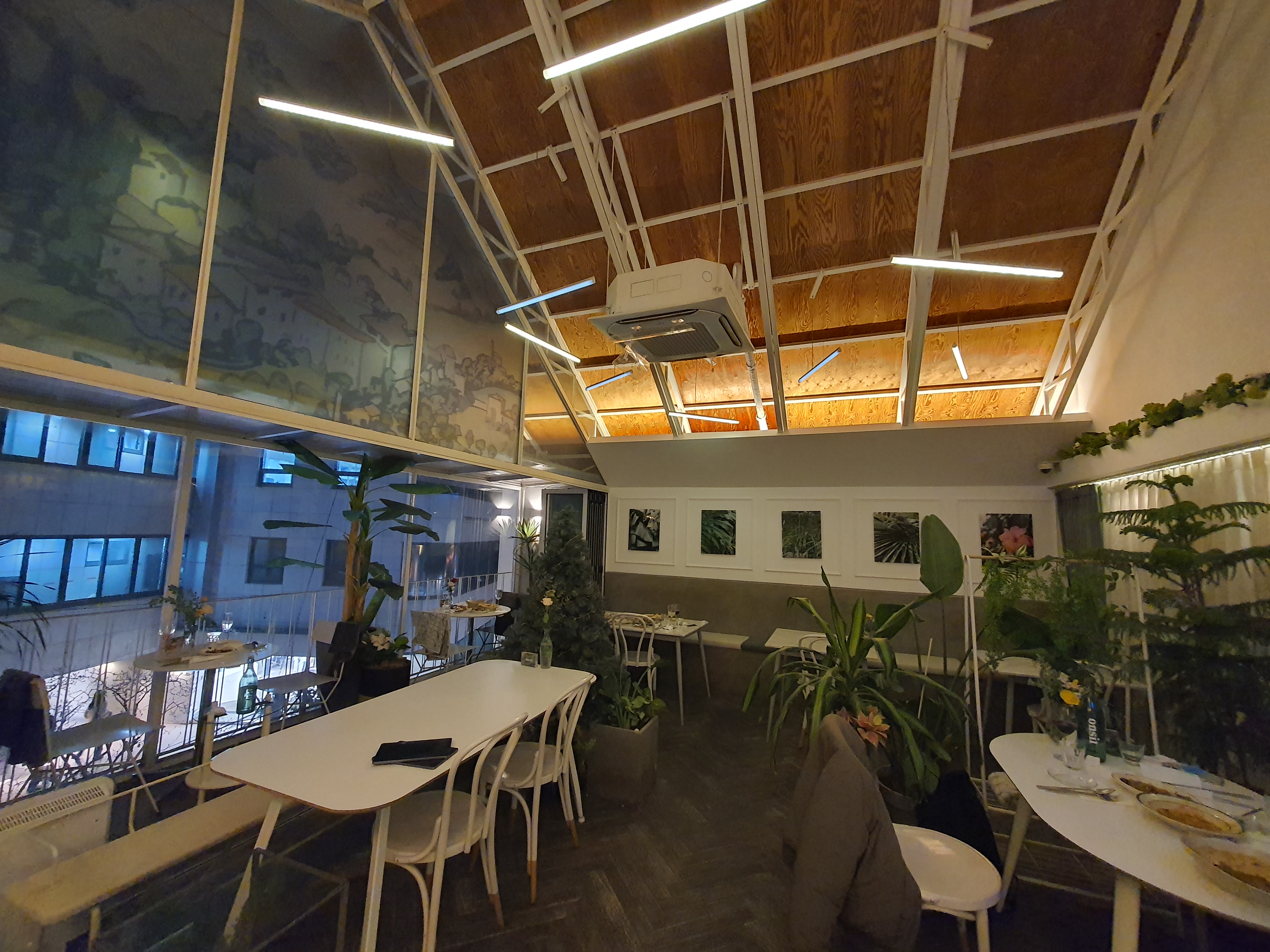 홍대입구역 3번 출구로 나와 조금 걸으면 바로 찾아갈 수 있습니다. 성수미술관 쪽으로 조금 걸어가다가 골목으로 들어서서 네이버 지도를 보며 걷다 보면 온실이 나옵니다. 온실은 연남동 맛집을 검색하면 워낙 많이 나오고 리뷰도 많아서 와이프와 같이 근처에 볼일이 있어서 볼일을 마치고 이곳에 데이트 겸 예약 없이 들렀습니다. 일요일 저녁시간입니다. 온실은 총 3층짜리 건물 중에 2~3층을 쓰고 있었습니다. 2층은 손님들에게 내어 줄 식기류들과 음식을 조리하는 공간이 있고 한쪽에 화장실도 따로 갖추어져 있습니다.