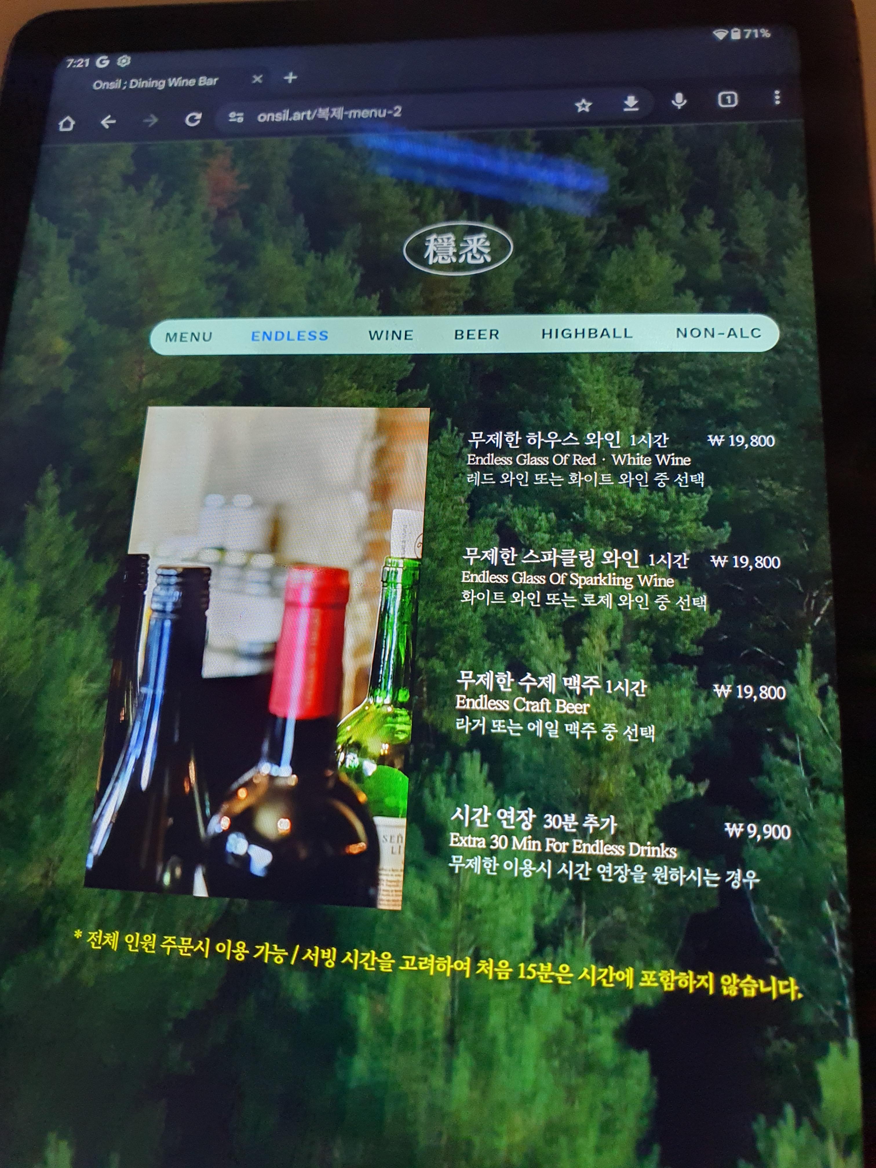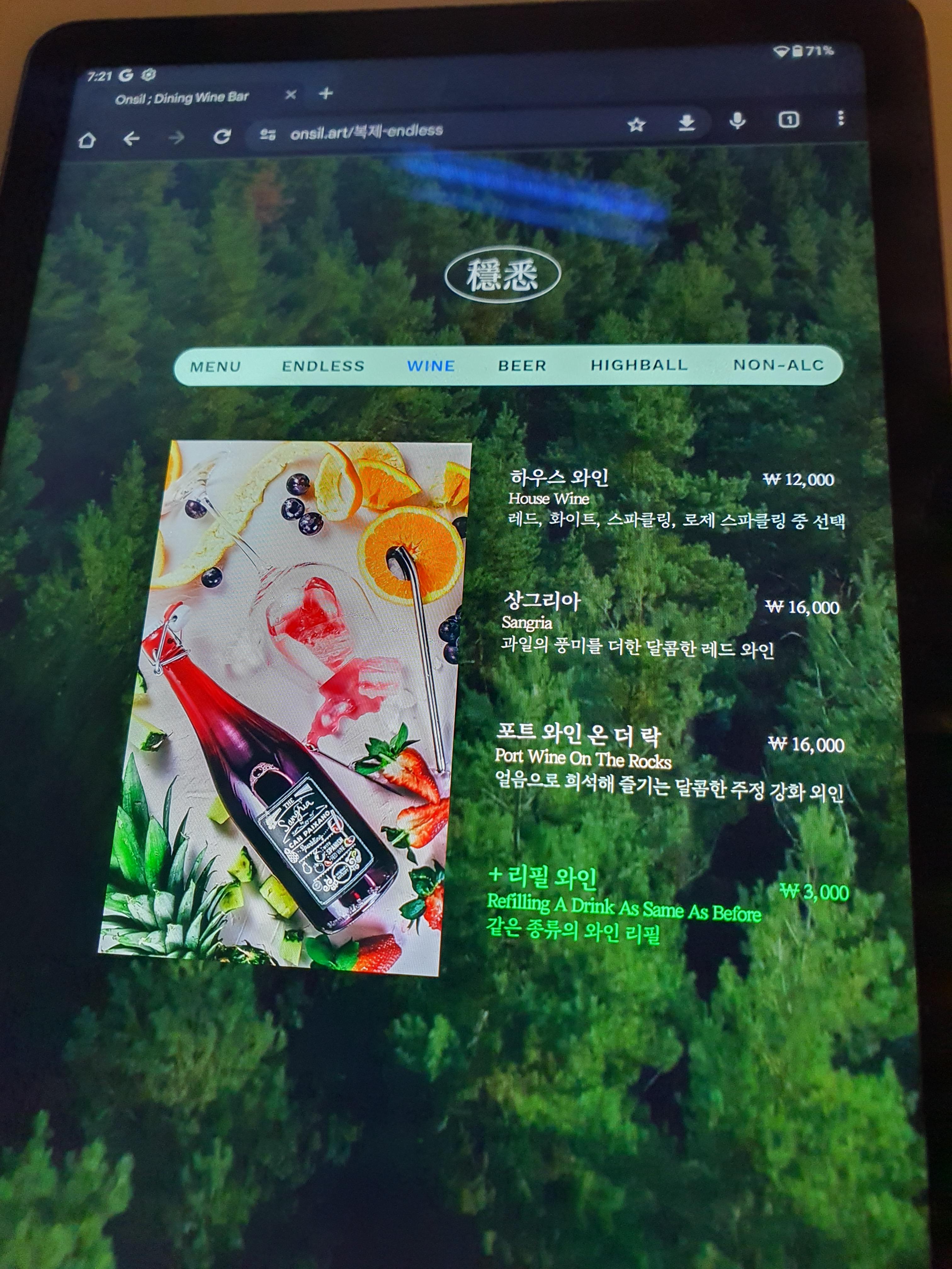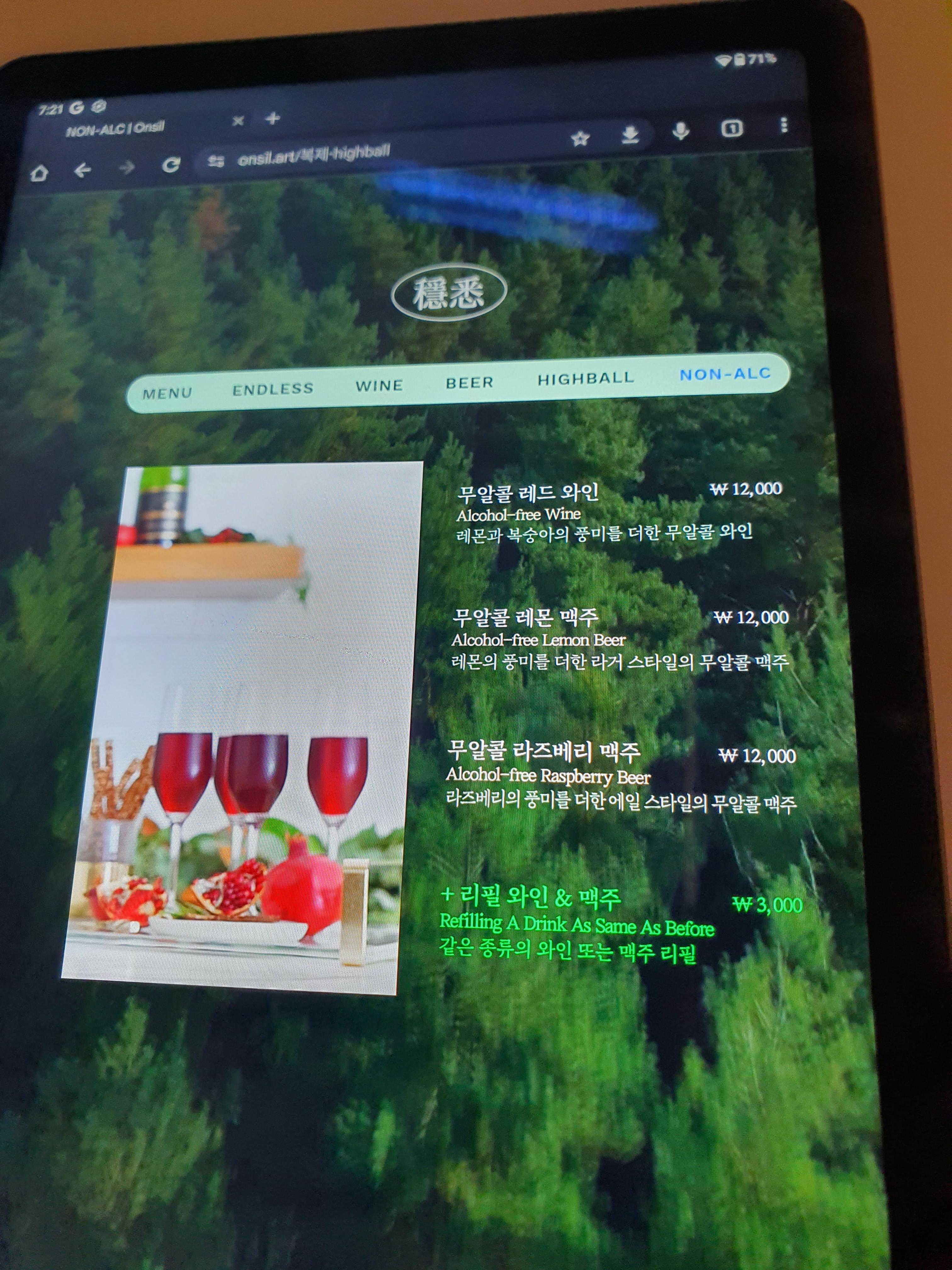 이곳은 태블릿으로 메뉴판을 디자인하여 만들었습니다. 이 메뉴판을 보고 주문했습니다. 이곳은 메인메뉴가 오직 한 가지 "맡김 차림(1인 29,800원)"입니다. 우리는 각각 맡김 차림을 주문하고 하우스와인(레드, 화이트, 스파클링, 로제스파클링) 중 택 1을 할 수 있어, 스파클링으로 2잔을 주문했습니다.