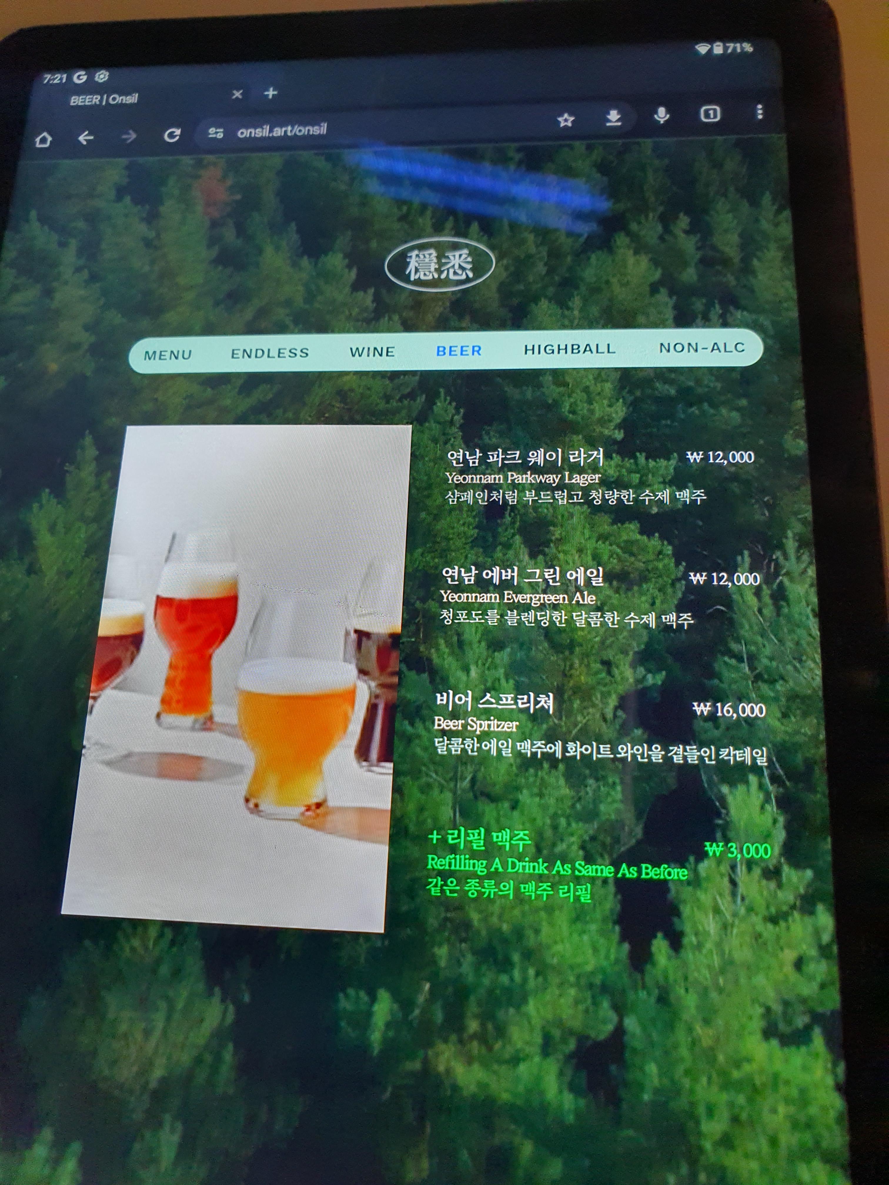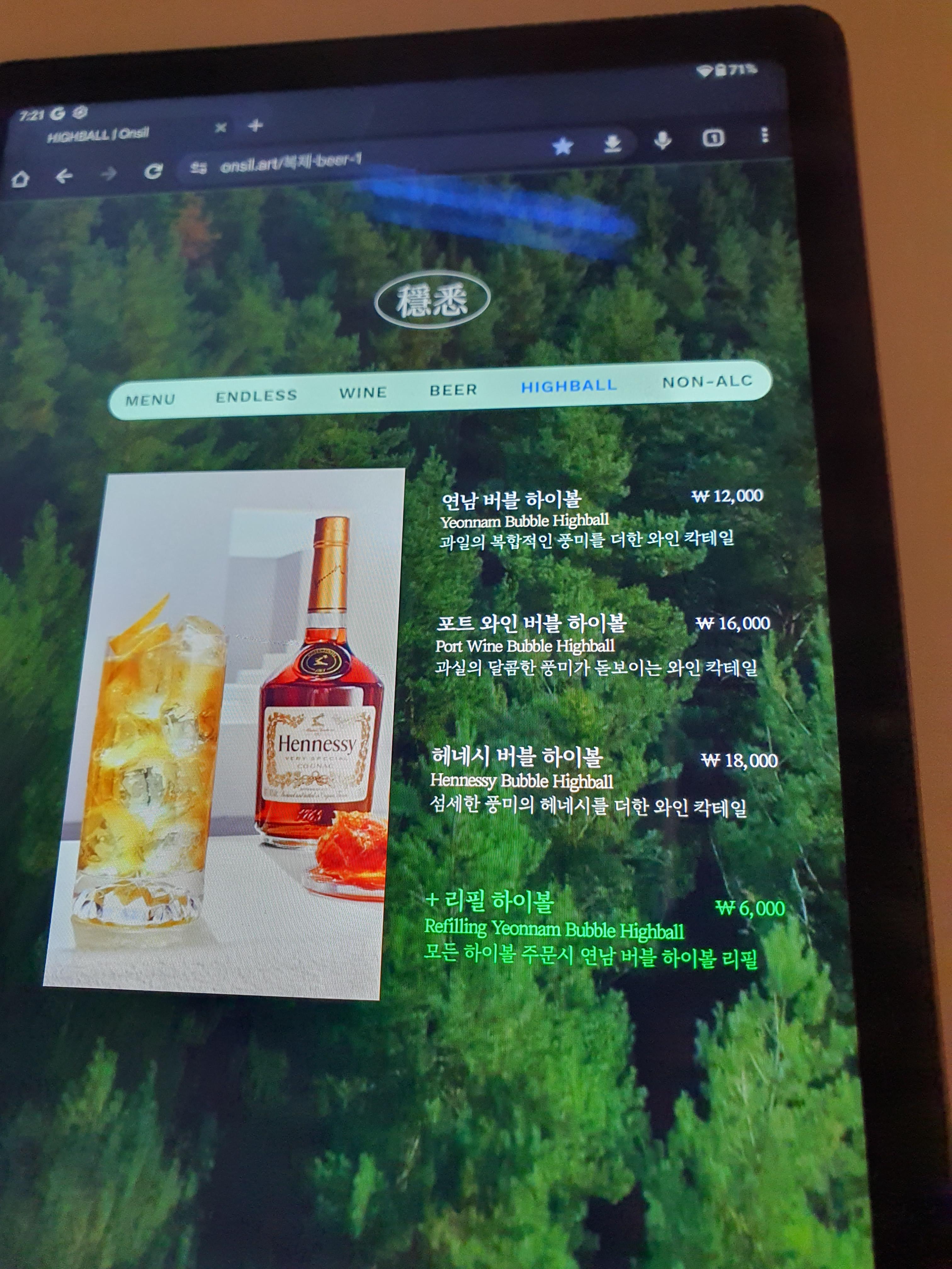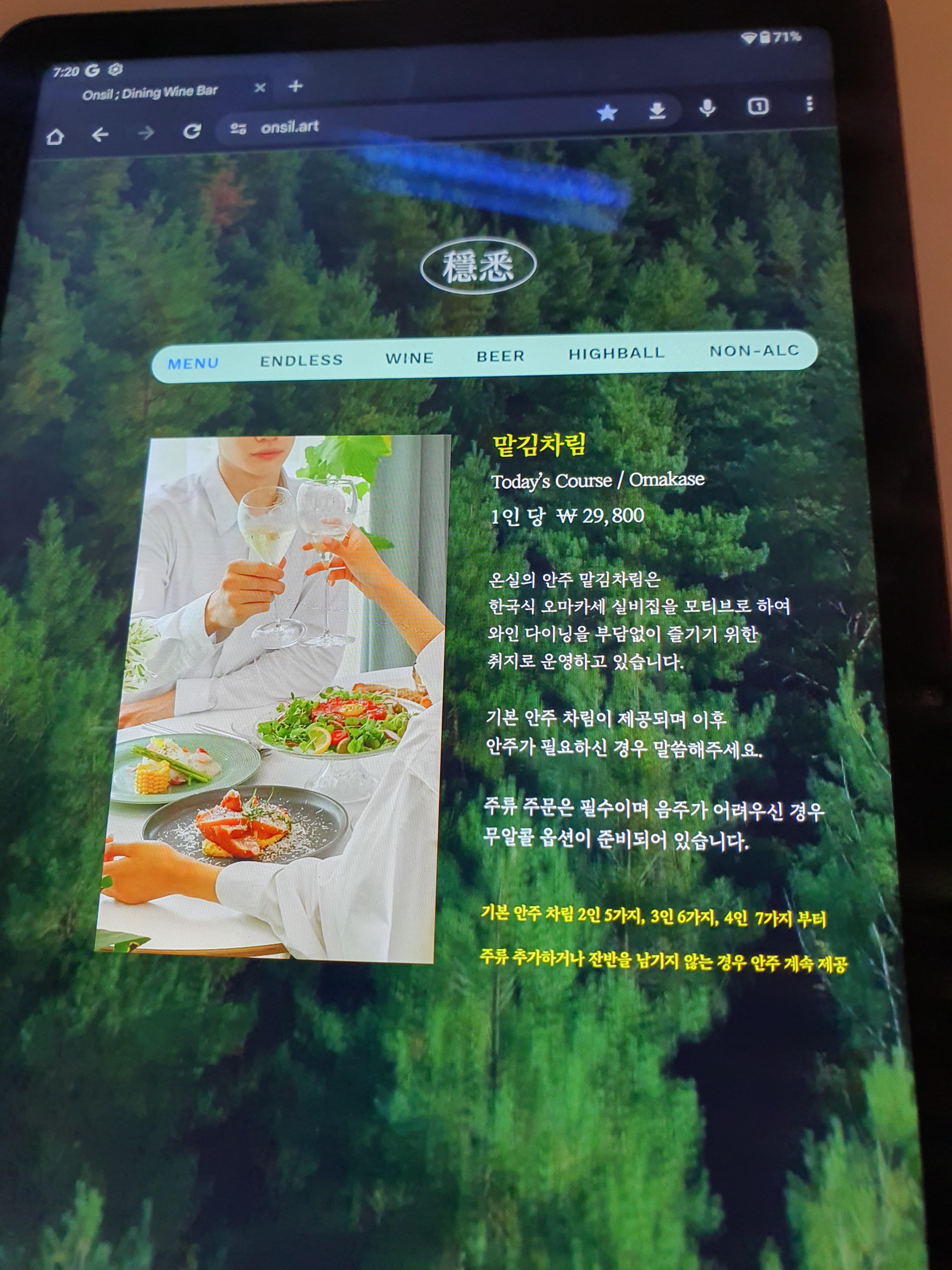 이곳은 태블릿으로 메뉴판을 디자인하여 만들었습니다. 이 메뉴판을 보고 주문했습니다. 이곳은 메인메뉴가 오직 한 가지 "맡김 차림(1인 29,800원)"입니다. 우리는 각각 맡김 차림을 주문하고 하우스와인(레드, 화이트, 스파클링, 로제스파클링) 중 택 1을 할 수 있어, 스파클링으로 2잔을 주문했습니다.