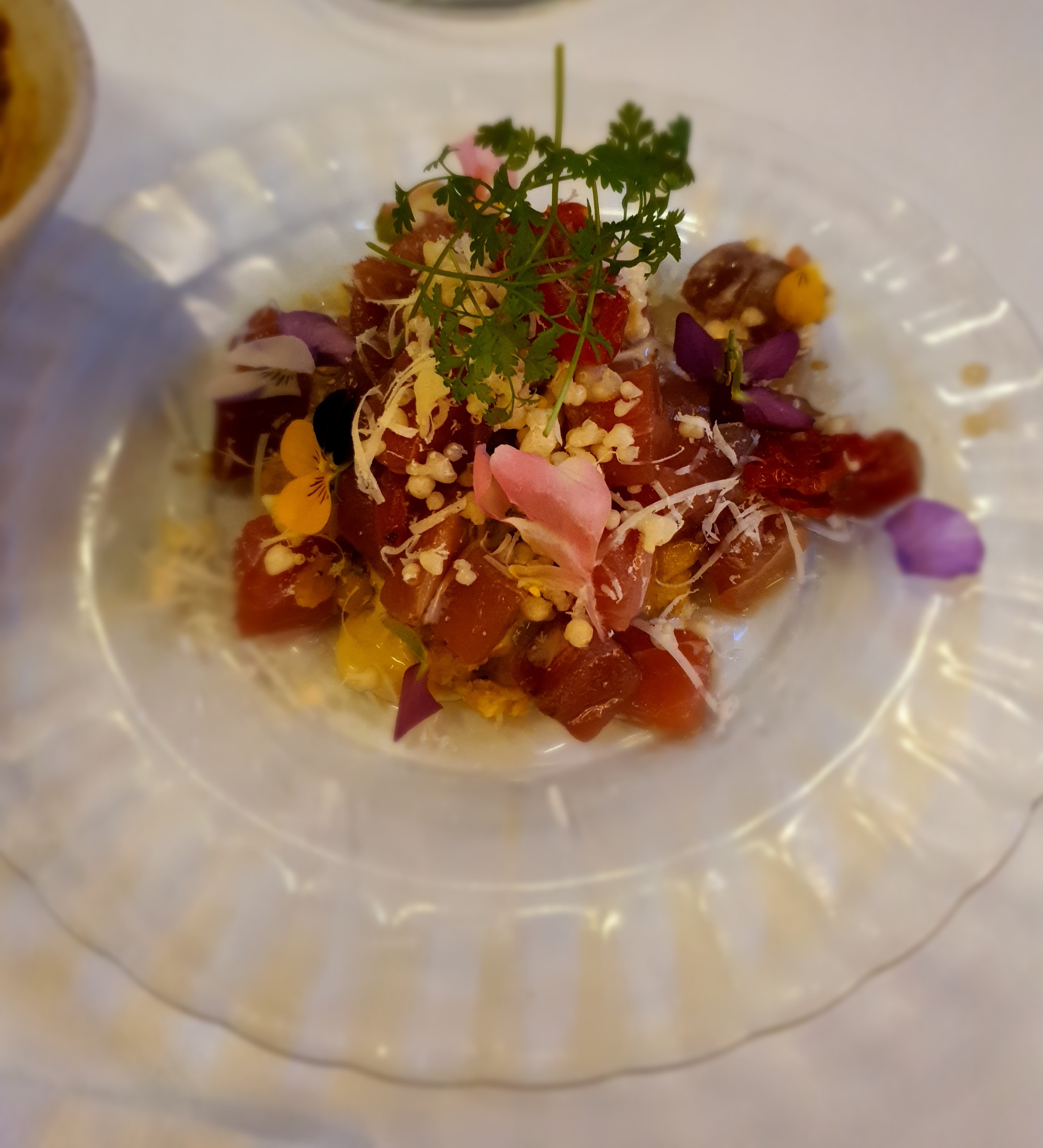 두 번째로 나온 음식은 참다랑어랍니다. 참다랑어 큐브아래에 스프레드 같은 고소한 맛이 나는 것이 깔려 있었는데, 참다랑어와 참 잘 어울리고 맛이 좋았습니다. 저는 맡김 차림 5가지 음식 중에 가장 괜찮았던 것 같습니다.