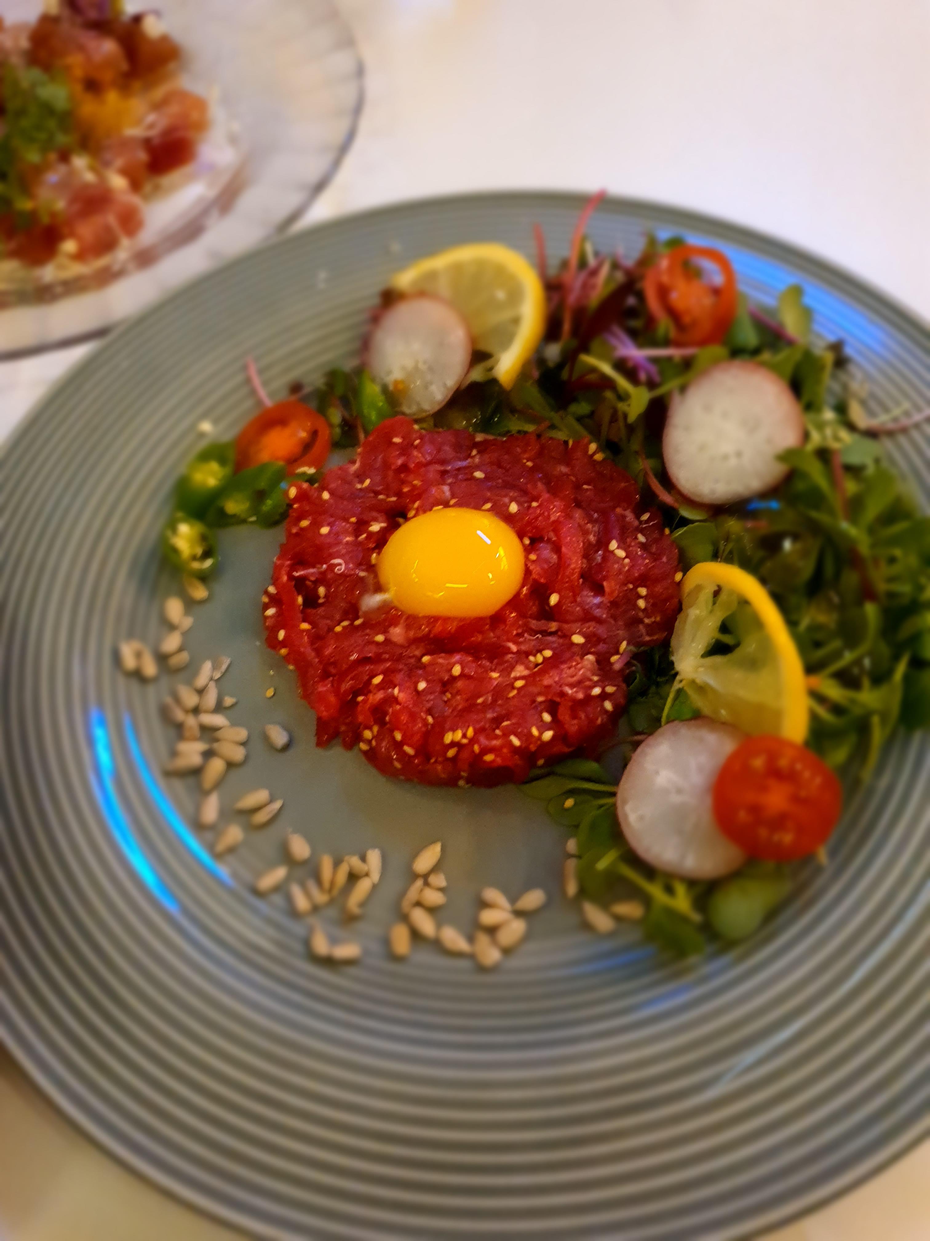 세 번째로 나온 음식은 1등급(?) 소고기 육회라고 하는데, 그건 잘 모르겠고 그냥 신선하고 무난했습니다. 다른 집처럼 육회에 참기름+간장+설탕이 잔뜩 들어가서 양념맛이 강하며 너무 달고 짠 그런 음식이 아니었습니다. 이 집은 고기에 소량의 참기름과 달걀노른자만 올려져 있었고, 저 샐러드가 조금 상큼하면서 달콤한데 그래서 그런지 샐러드와 육회를 같이 곁들여 먹으면 맛이 조화로웠습니다.