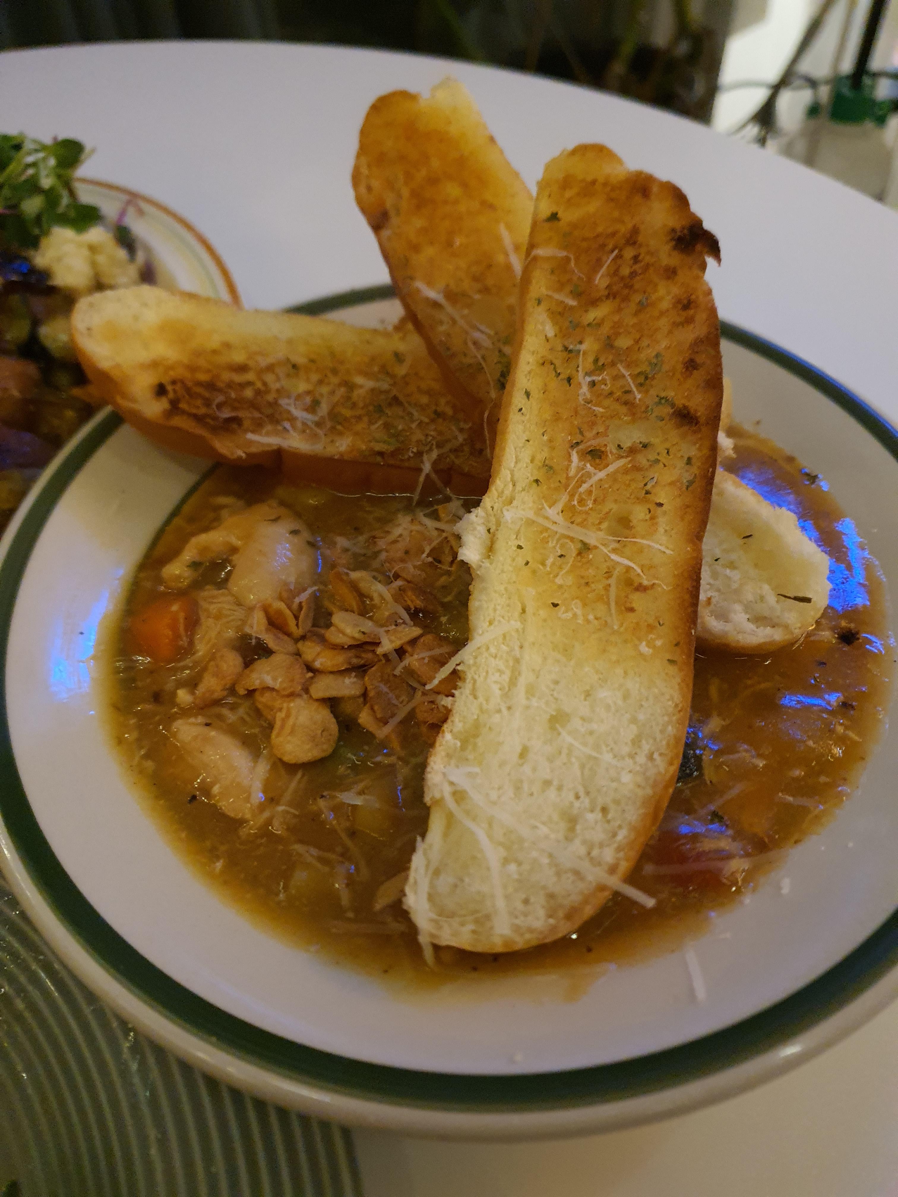 다섯 번째로 나온 음식입니다. 닭고기스튜라고 설명을 해주셨습니다. 카레가 들어갔습니다. 메뉴명이 닭고기 카레스튜가 더 잘 어울릴 것 같습니다. 가운데에 올려준 빵 3조각이 꽤 컸습니다. 양이 많았습니다. 닭고기 카레스튜 역시 서양식 음식에 동양식이 약간 가미된 맛의 느낌이 드는 음식이었습니다.